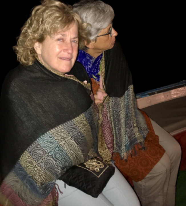 A cold early morning on the Ganges River waiting for sunrise. Feroza and Janice keeping each other warm on the boat trip